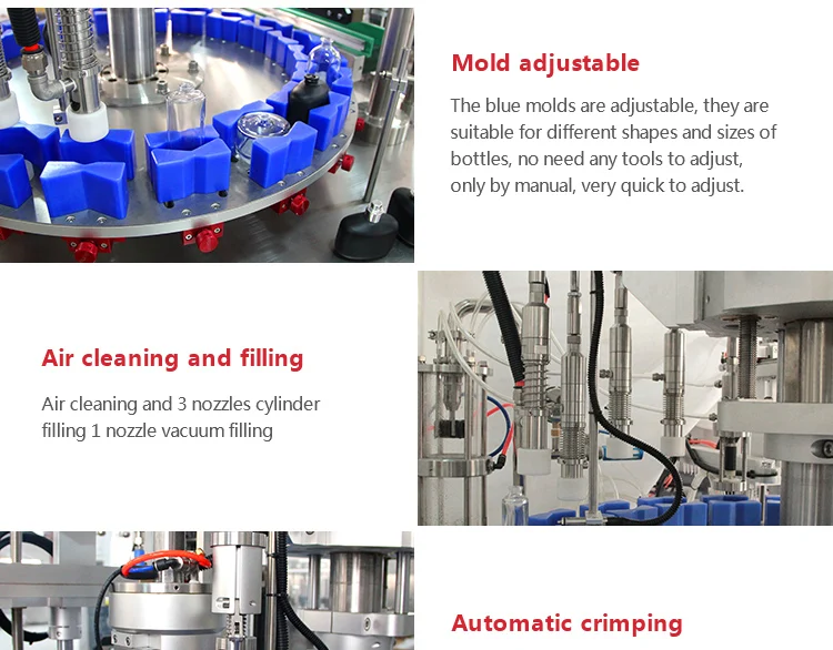 * Air cleaning, filling, collaring/capping, output. * Peristaltic pump is more suitable for filling water aqua, with high filling accuracy. * Touch screen control, convenient operation and adjusting * Including collaring and capping functions, suitable for different sealing methods. * Servo motor driving capping, adjustable torque speed for protecting caps. * Only need to change molds when filling different container, convenient operation. * Suitable for the daily output of 15000-25000.